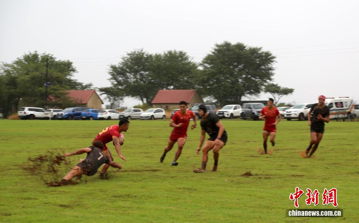 当地时间3月15日,中国七人制男子橄榄球队在南非林波波省莫迪莫勒与多只当地球队进行交流赛。图为中国队球员在场上奋力拼搏。中新社记者 孙翔 摄