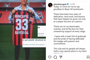 体育资讯9月2日讯 阿森纳已经官宣引进勒沃库森中卫因卡皮耶,后者也通过社媒发文向药厂告别: