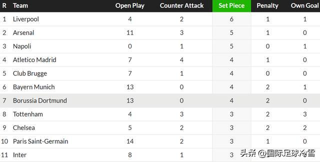 不止看联赛,也看欧冠表现的话,多特蒙德前7轮通过角球、定位球攻入4球,是欧冠并列第四多,比通过定位球打入3球的国米更多。